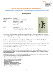 Qigong Yangsheng - Lehrsystem Prof. Jiao Guorui - stärkt durch meditative Bewegungsabläufe die innere Sicherheit und Präsenz für den beruflichen Alltag. Inhalte: Grundlagen der Traditionellen Chinesischen Medizin, Yin- und Yang-Prinzip, 5 Wandlungsphasen, Übungen in Bewegung und in Ruhe.