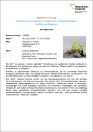 Resilienz ist gleichermaßen Elastizität und Widerstandskraft, die uns schwierige Situationen erfolgreich überstehen lassen. Sie befähigt Menschen, flexibel und konstruktiv mit beruflichen und privaten Niederlagen und Rückschlägen umzugehen. Das Resilienz-Training versteht sich als Bewusstseinstraining und wirkt als gezieltes Stressmanagement und Burnout-Prävention. Sie lernen, durch die Stärkung Ihrer Widerstandsfähigkeit beruflichen Druck und schwierige Situationen zu meistern und stellen gewohnte Denk- und Verhaltensweisen auf den Prüfstand.